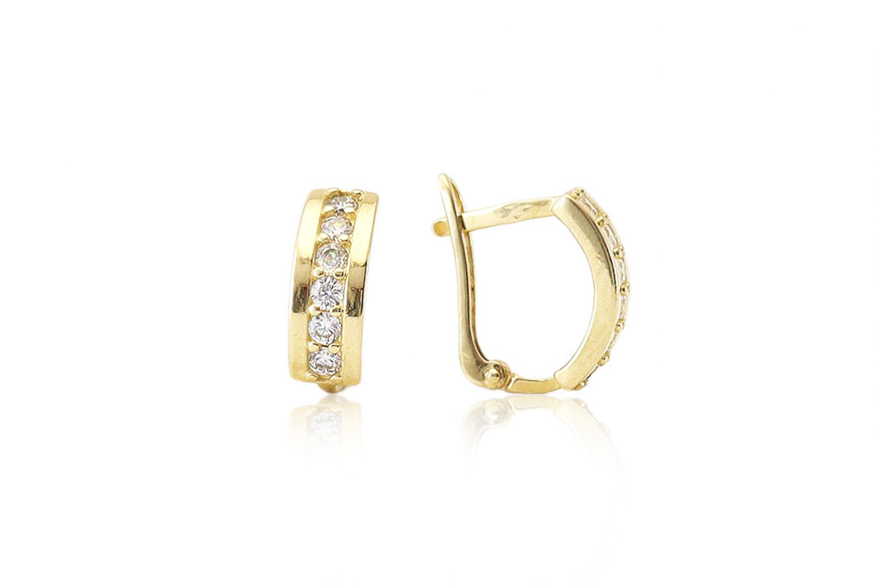 Ez a szépséges arany fülbevaló, melyet fehér cirkónia kövecskék díszítenek, egyszerre csillogó, elegáns és egyedi.