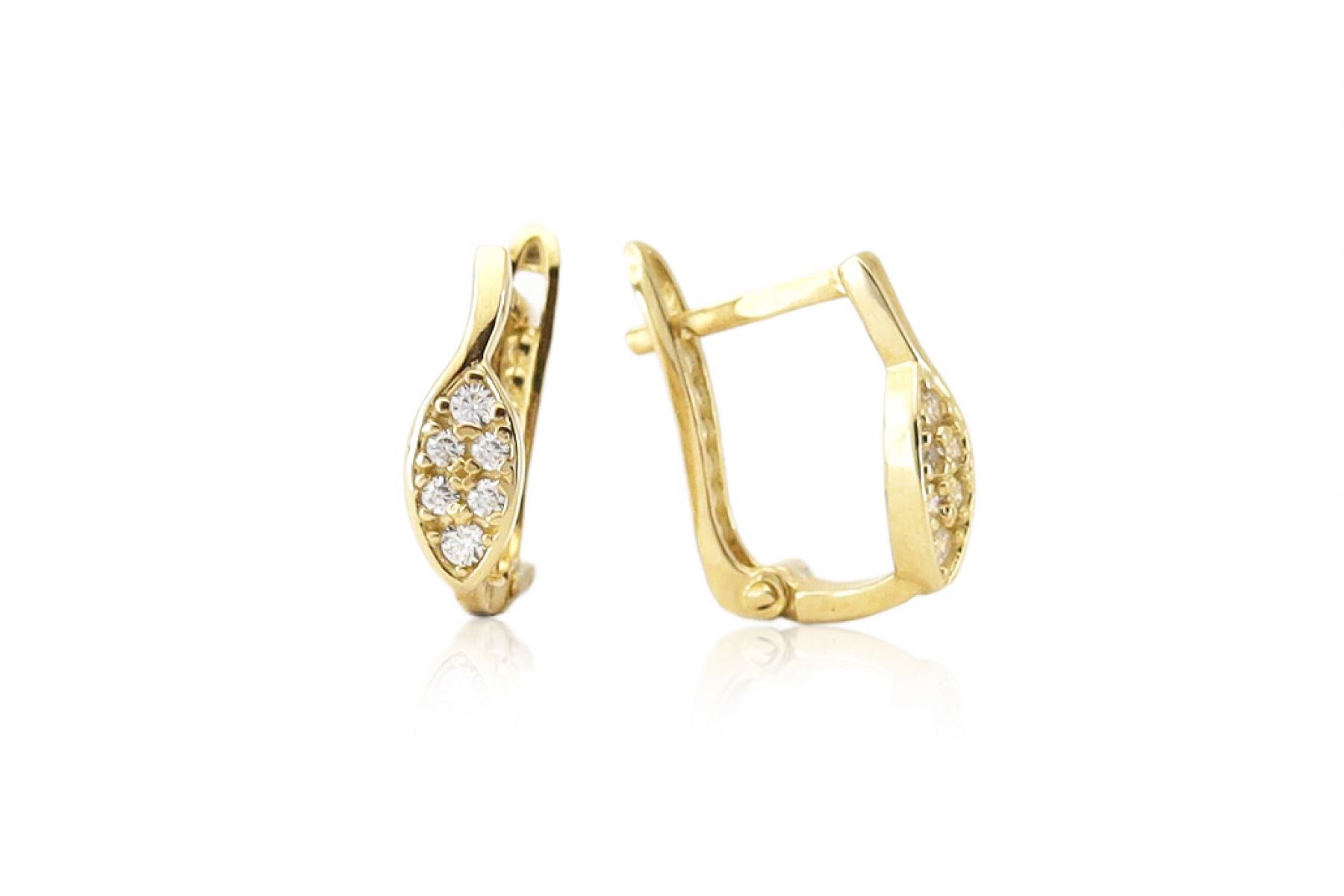 Ez a szépséges arany fülbevaló, melyet fehér cirkónia kövecskék díszítenek, egyszerre csillogó, elegáns és egyedi.