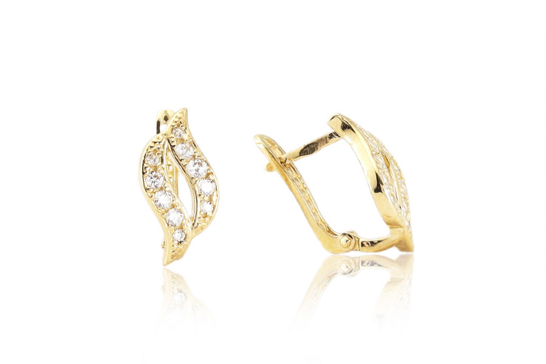 Egyszerre elegáns és modern ez a 14 karátos sárga aranyból készült, apró fehér cirkónia kövecskékkel díszített fülbevaló! Ajánljuk minden olyan hölgynek vagy leányzónak, aki szeretne egy aprócska új ékszert, melyet örömmel viselhet a legkülönbözőbb alkalmakra, a legkülönbözőbb ruhákhoz és öltözetekhez. :)