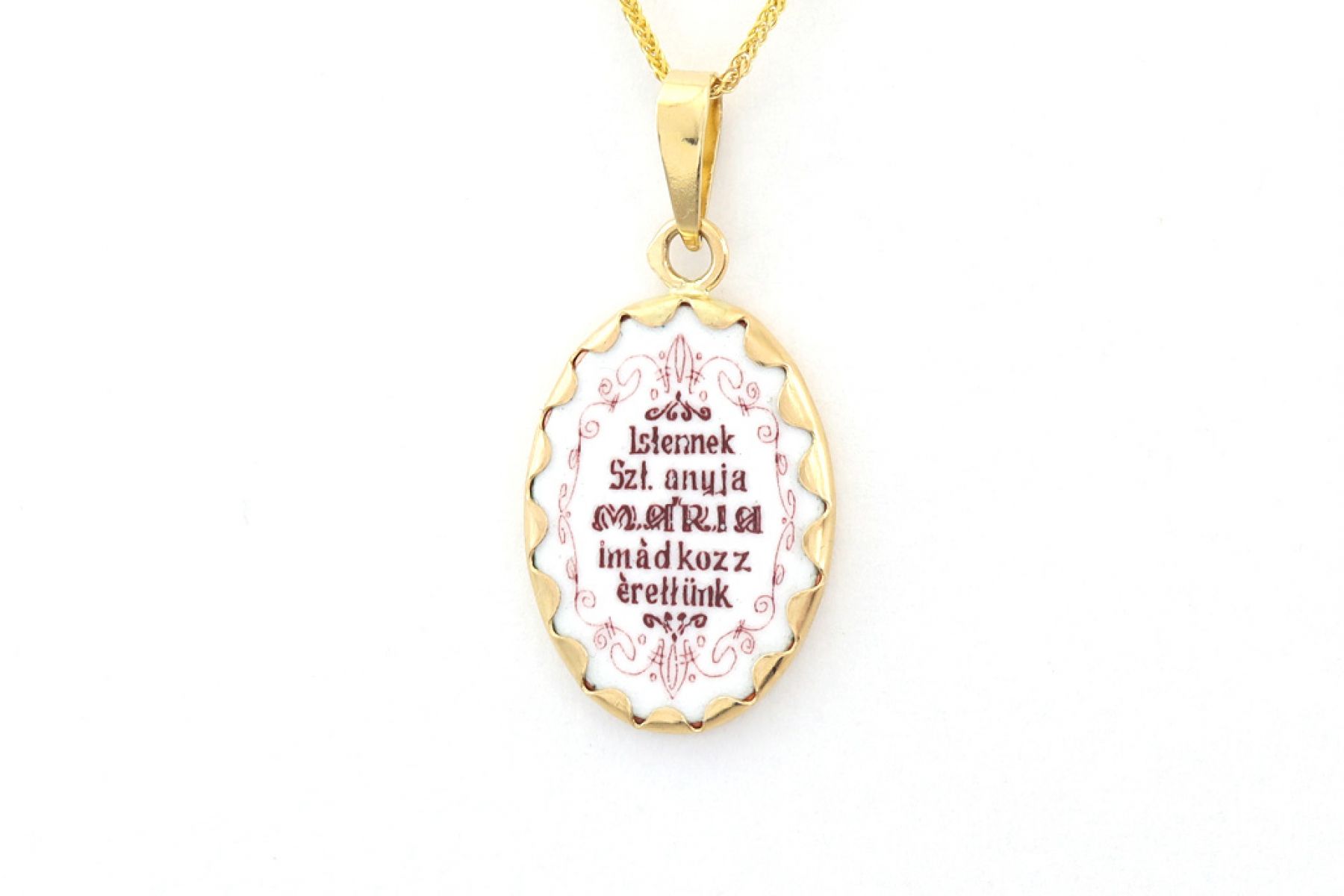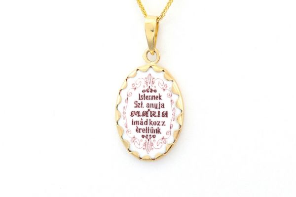 Ez a kézzel festett apró kis arany medál igazán különleges! Az elején Mária látható a kis Jézussal, a hátulján pedig ez olvasható: "Istennek Szt anyja Mária imádkozz érettünk".