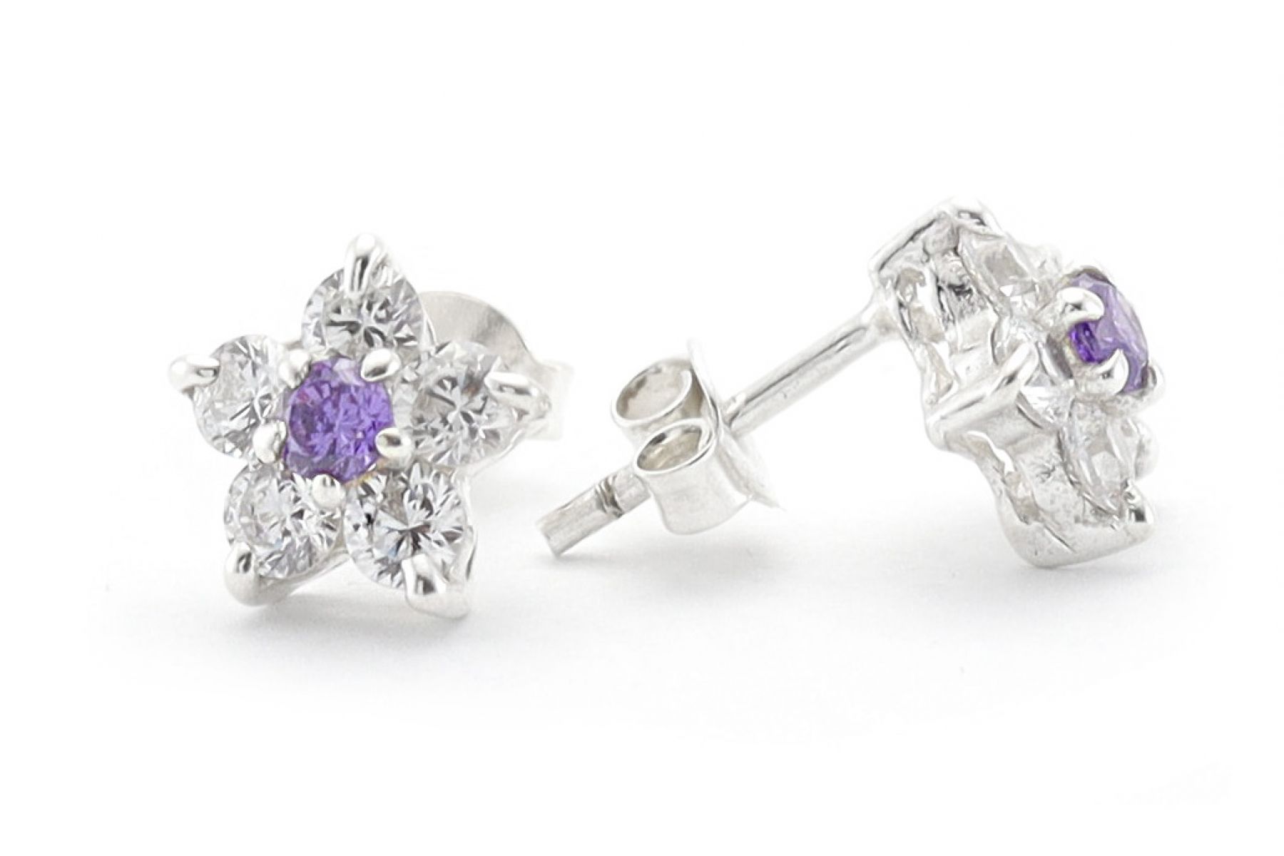 Ragyogóan szép ez az apró lila és fehér cirkónia kővel díszített ezüst fülbevaló.
