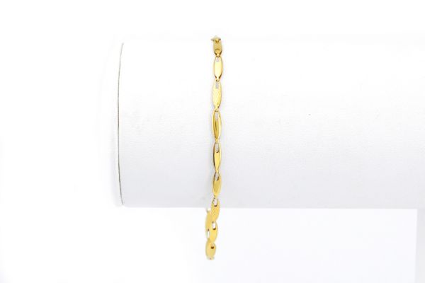 14 karátos aranyból készült ez a szépséges, keskeny szemekből préselt, elegáns karkötő. Önállóan, bármilyen alkalomra, télen vagy nyáron, különleges vagy baráti alkalmakra, otthon, utcán, színházban, vagy éppen egy romantikus randevún egyaránt megállja a helyét!