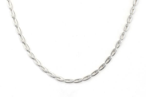 Egyszerre elegáns és különleges ez a vésett préselt szemekből készült ezüst nyaklánc. Mindenféle öltözethez tökéletes, akár rétegezett nyaklánc részének is, de önmagában is szép, egyedi ékszer.