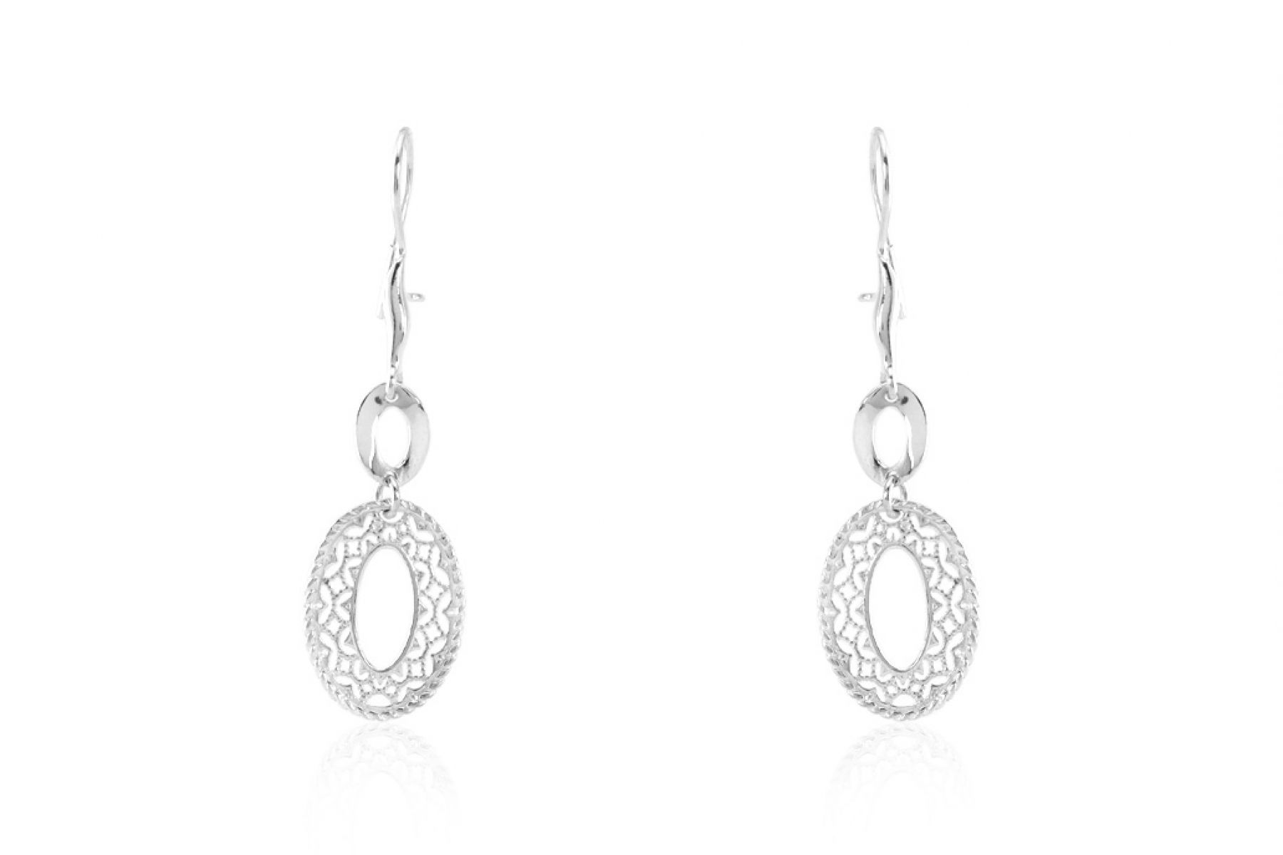 Különösen finom és elegáns ez a beakasztós, ovális formájú, áttört csipke mintájú ezüst fülbevaló.