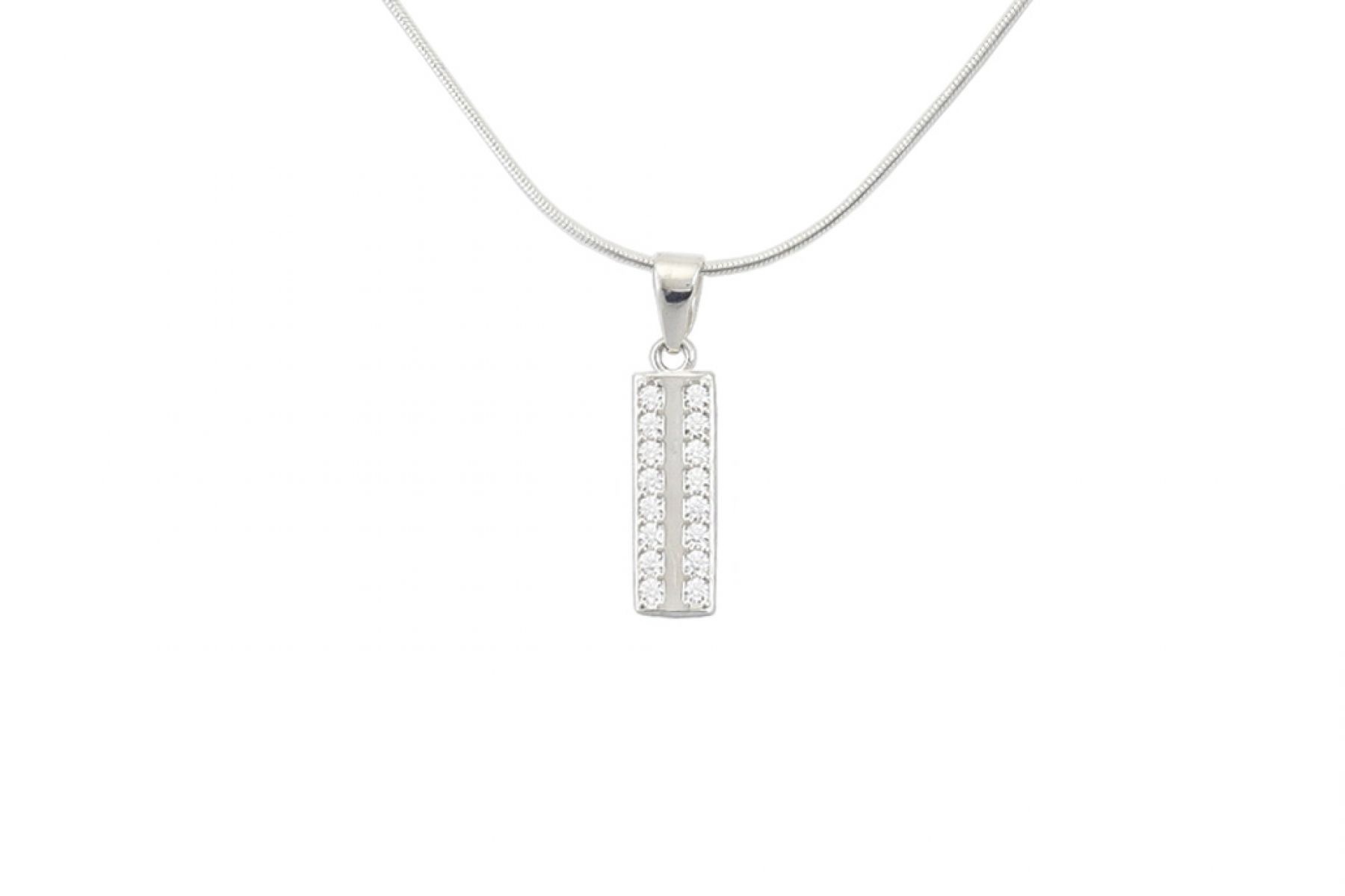 Gyönyörű és elegáns ez az apró, fehér cirkónia kövekkel díszített, modern mintájú ezüst medál.