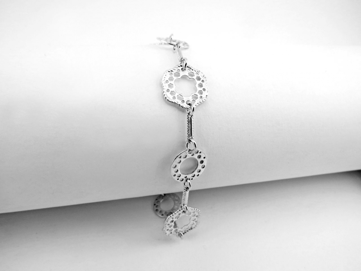 Aranyos és elegáns ez a virágokkal és körökkel díszített ezüst karkötő.